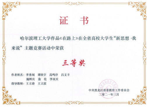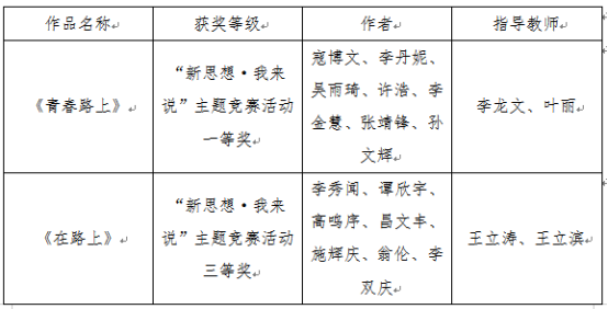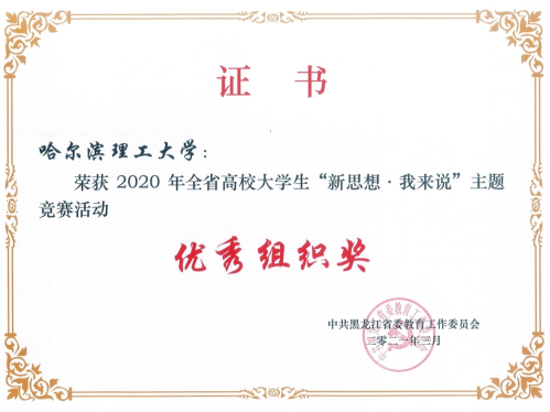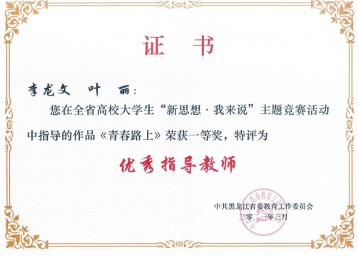 为深入推进习近平新时代中国特色社会主义思想进教材进课堂进头脑,坚持不懈用习近平新时代中国特色社会主义思想铸魂育人,深入实施新时代学校思想政治理论课改革创新先行试点专项工作,省教育工委开展了全省高校大学生“新思想·我来说”主题竞赛活动,我校高度重视此项活动,党委学生工作部与马克思主义学院共同制定方案、发布通知、广泛宣传动员、精心组织申报,我校推荐的作品获得一等奖一项、三等奖一项、李龙文、叶丽两位教师荣获“优秀指导教师”称号,我校获得“优秀组织奖”称号。