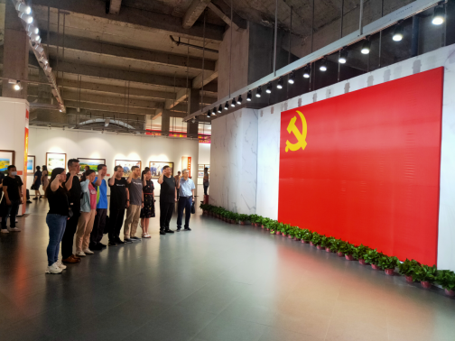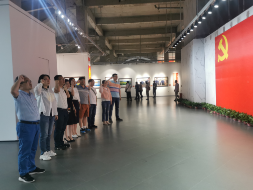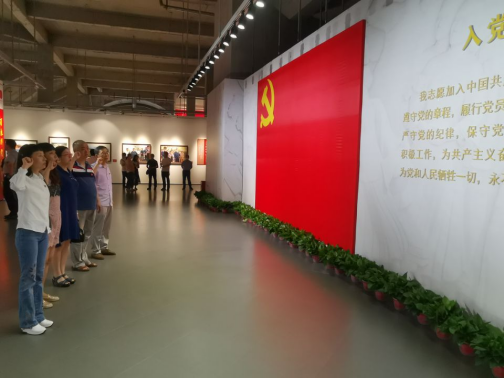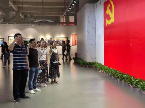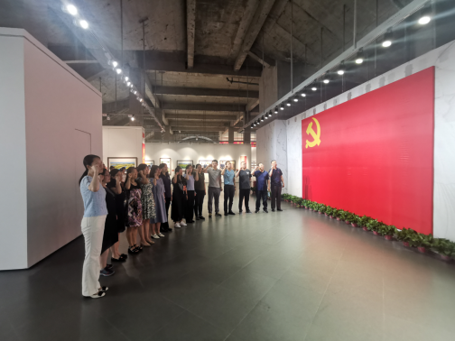 在哈药当代美术馆,大家跟随讲解员的脚步详细参观了庆祝中国共产党成立100周年黑龙江省优秀美术书法摄影作品展,旨在描绘在党的领导下黑龙江各个历史时期的重大事件、人物典型,书写中国共产党人的理想信念和初心使命。随后,党员教师们以支部为单位在庄严的党旗下举起右手,重温入党誓词:“我志愿加入中国共产党……”。重温入党誓词不仅仅是一种追忆、一种传承,更是在汲取一种力量,提醒党员要牢记自己的承诺与使命,提升基层党组织的凝聚力和战斗力,进一步坚定了党员教师们为党的教育事业奋斗终生的理想信念。